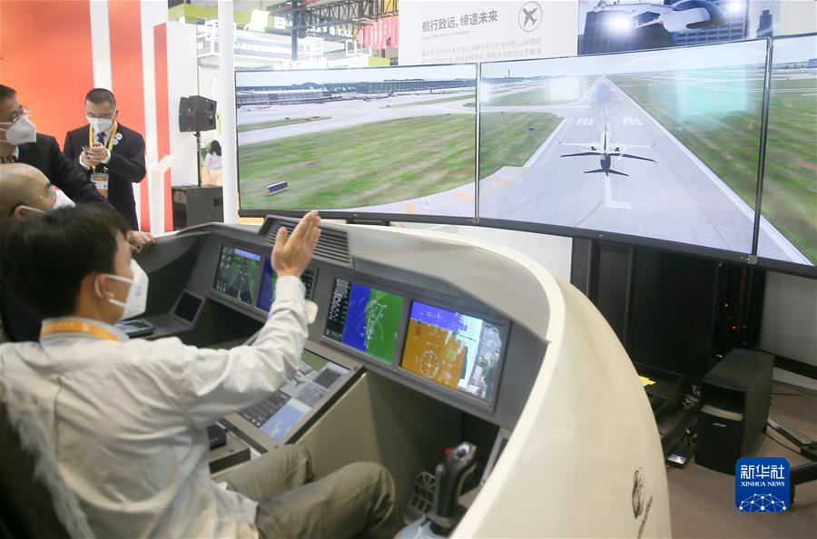 2022年11月5日,在第五屆進博會技術裝備展區(qū)霍尼韋爾展臺,參觀者在工作人員指導下體驗模擬飛行。新華社記者 張可任 攝