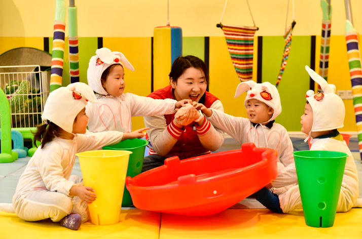2025年2月20日,在山東省日照市東港區(qū)知子樹托幼園,老師陪伴孩子做游戲。新華社記者 郭緒雷 攝