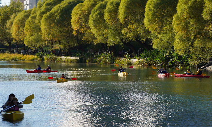 市民在北京亮馬河上體驗皮劃艇(2022年10月22日攝)。新華社記者 陳鐘昊 攝