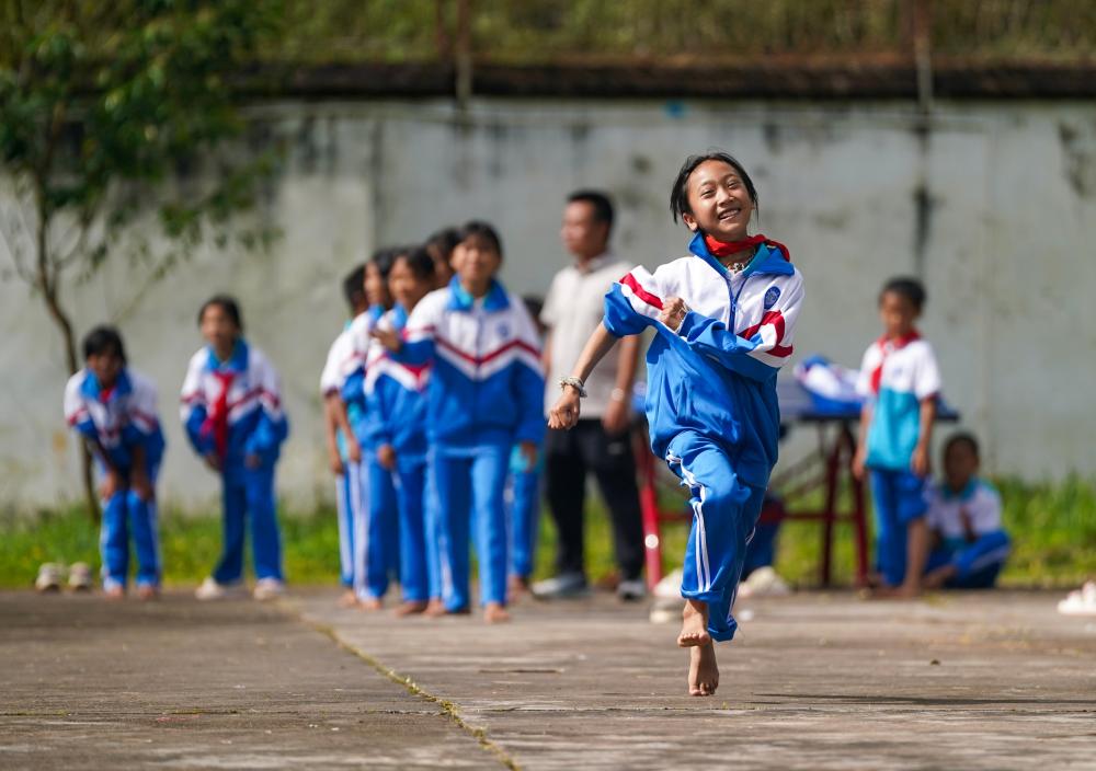 在云南省普洱市孟連傣族拉祜族佤族自治縣,臘福小學學生課間在操場進行奔跑接力比賽(2025年9月15日攝)。新華社記者 陳欣波 攝